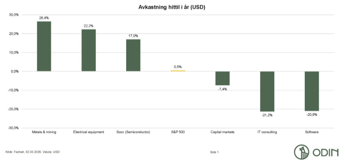 Rädslan för hur AI kan underminera affärsmodeller spred sig gradvis till andra delar av marknaden, såsom konsultverksamhet, utbildning samt tjänster inom finans, juridik och fastigheter. I andra änden av spektrumet finns bolag inom energi, infrastruktur, hårdvara och halvledartillverkning, som uppfattas som vinnare på utbyggnaden av AI-infrastruktur.
