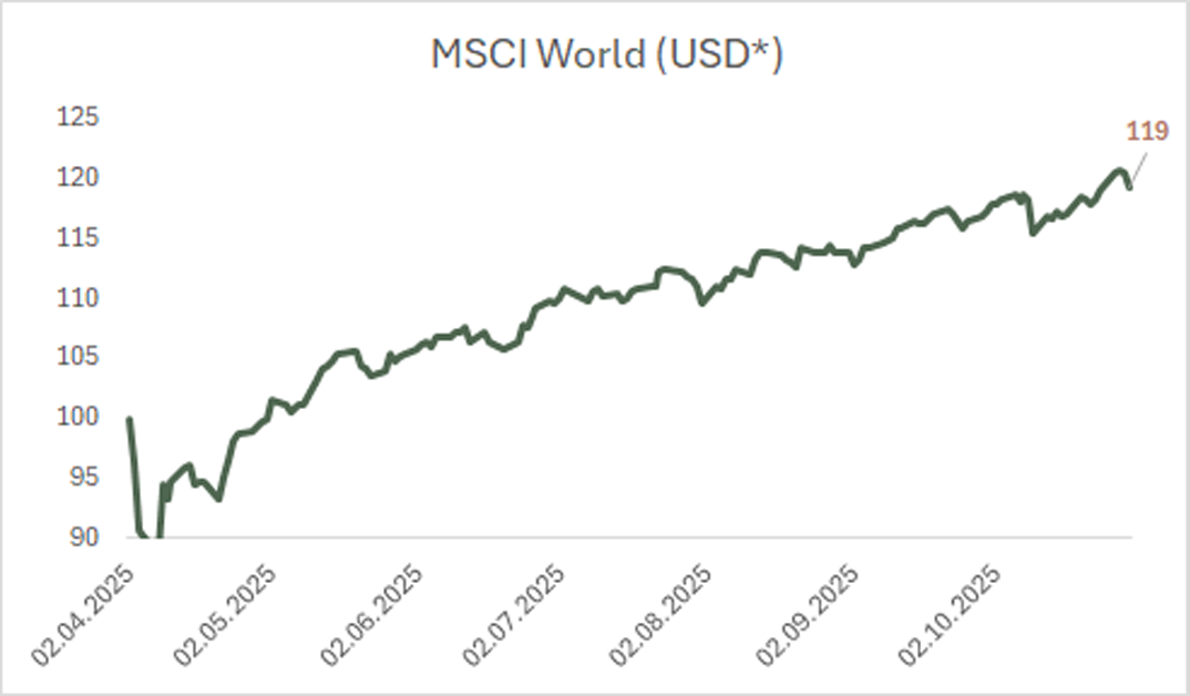 Oktober blev en ovanligt stark månad på börserna. Fortsatt optimism kring AI och nytt hopp om ett handelsavtal mellan USA och Kina var de viktigaste drivkrafterna bakom uppgången. I USA fortsätter IT-aktier att stiga, och i Asien steg den japanska börsen kraftigt. Nikkei-index i Japan ökade med över femton procent i oktober, mycket tack vare valet av Sanae Takachi som ny premiärminister. Även börserna i Europa utvecklades starkt under månaden. Helsingforsbörsen steg med över tio procent tack vare mycket goda resultat från flera stora finska bolag.